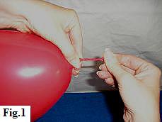Blow up the latex balloon, either with your mouth or a balloon pump. Stretch out its neck and twist it two or three times (fig. 1). Insert the neck into one of the slots of the cup (fig. 2).