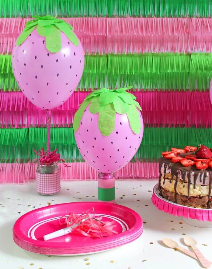 These fun decorations are super easy to make. All you need are pink 11 inch latex balloons, a black marker, green crepe paper, glue, paper straws and empty jars as base. Or you could hang them from the ceiling with fishing line.