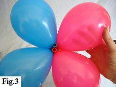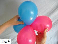 Bring the two sets of 5" balloons together in the shape of a cross (fig. 3). Then rotate two of the balloons one full turn to keep your cluster of four balloons together (fig. 4).