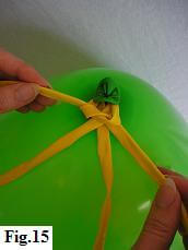 O.K., he's grinning and staring right back at you, but maybe he looks a bit thin on top! So, let's give him a few strands of hair. To do this, take two twisting balloons and tie them in the middle around the knot on the top of his head (fig. 15).