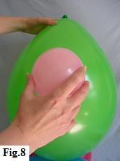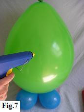 Now blow up another 5" balloon for the nose. Put a little blob of glue right in the middle of the balloon head (fig. 7). With the knot facing the head, attach the nose so that it points downwards (fig. 8).