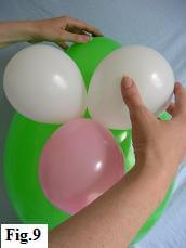 Blow up two white 5" balloons for the eyes and with the knots pointing down and towards the nose find the best position for them. Once again, put two little blobs of glue there and attach the balloons (fig. 9).