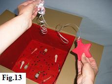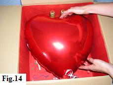 Next, tie the balloon weight to the other end of the ribbon (fig. 13) and place the balloon heart in the box (fig. 14).