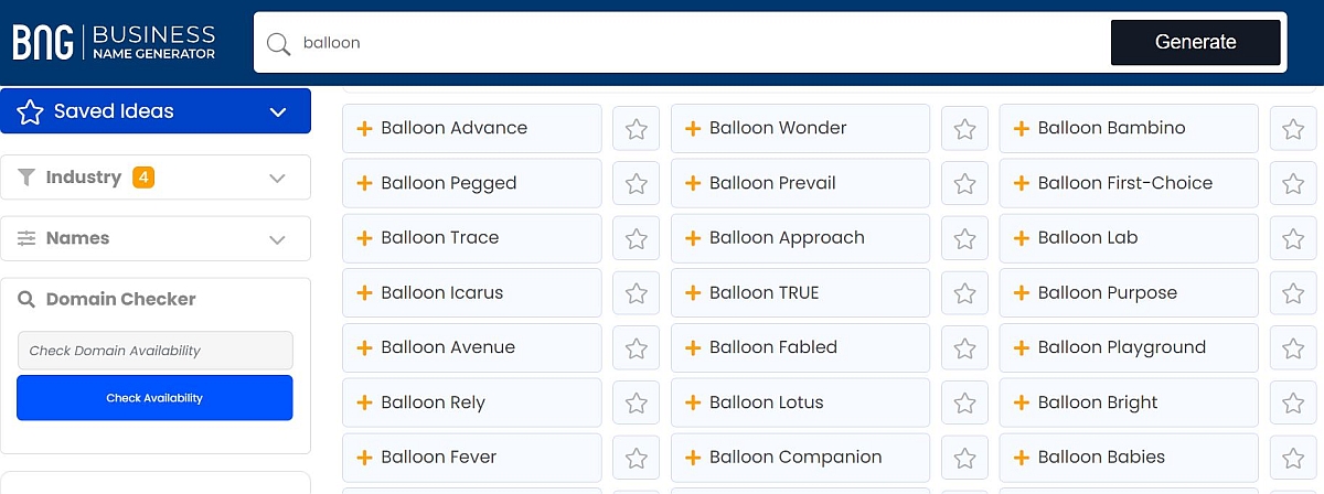 Small sample of the Business Name Generator results for the keyword "balloon."Refine the results by number of words, number of characters and whether you want your business name start or end with your keyword(s). You can also filter by industry.