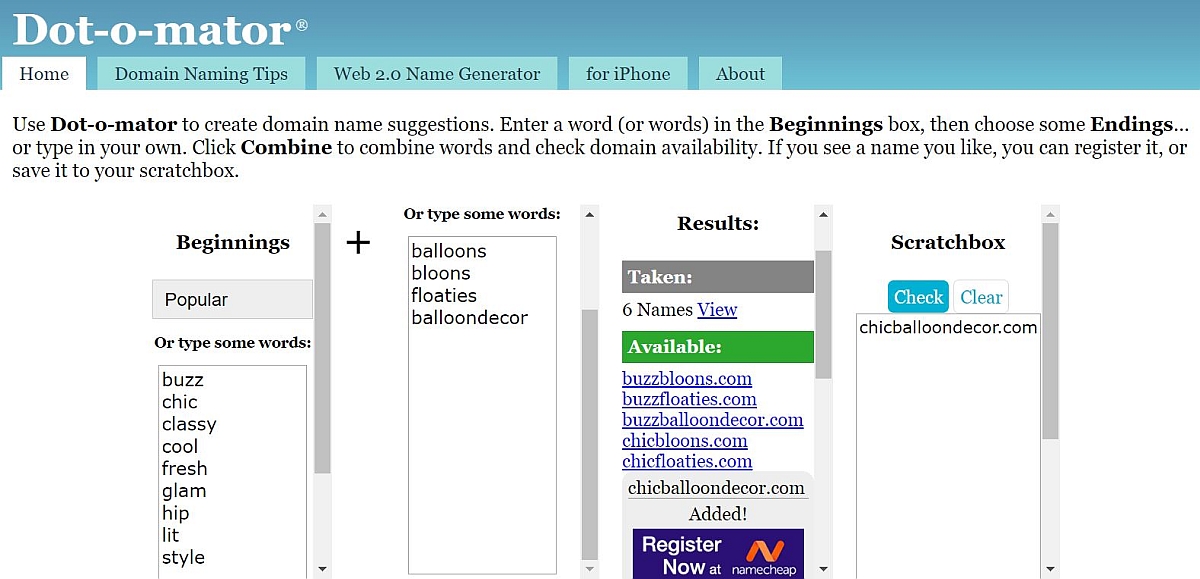 Dot-o-mator's interface may not be the prettiest, but it works well!The first two boxes are where you either select beginnings and endings from categories like popular or colorful or you enter your own words.