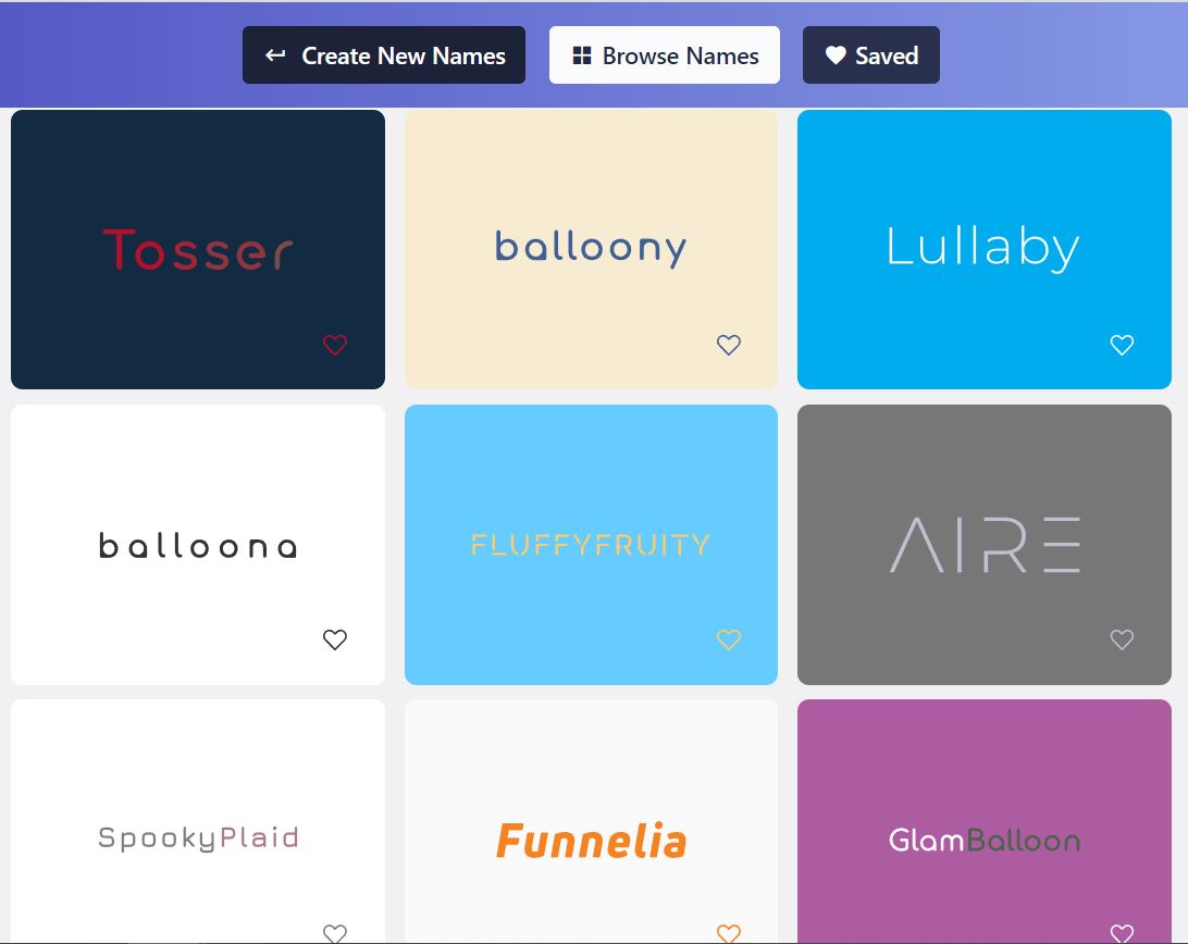 Small sample of balloon business name suggestions generated by Namelix.Click the heart icon to add any name you like to the "saved" tab.