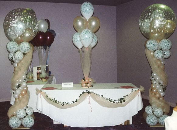 Majestic balloon columns on either side of the head table are a "must" for your head table decorations. There is no better way to highlight the focal point of the wedding reception.