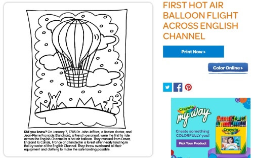The selection is small, but they have some nice little extras: on the coloring sheet you get some interesting facts related to the topic (for example about the first balloon flight in the States and the first flight across the English Channel), you can print the pages or color them online, you can cut out the forms and create a mobile.