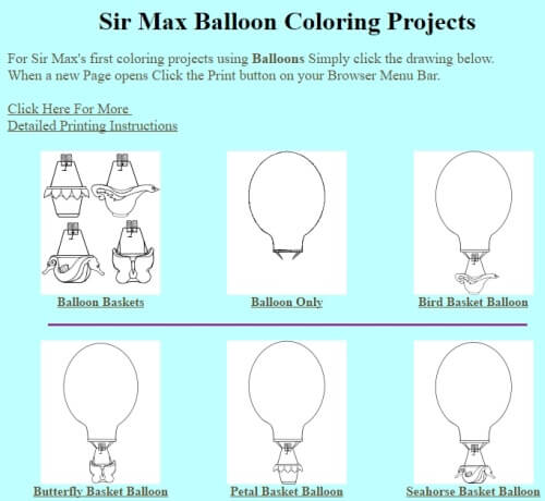 Another decent resource with an extra category for hot air balloons. They have 7 coloring pages in this category, including one coloring picture of a zeppelin.