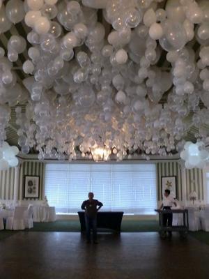 The question is how to attach them to the ceiling. The best solution would be to span several lines of wire across the ceiling and then attach the balloon clusters to it.
