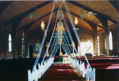 The balloon design was created for this church. My bride wanted something different. So with the wonderful ceiling lines I created the Enchanted Isle. I used 6" tulle, with an 18" latex helium filled to create this look.